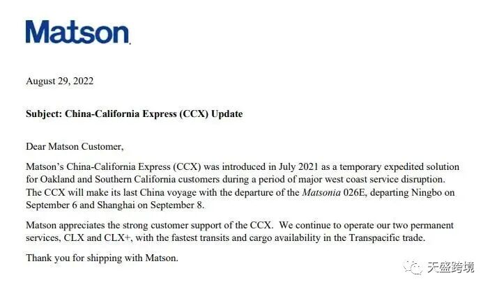 近日,根据美森快船发出的最新一份公告显示,美森CCX航线将于9.6最后一水船驶离中国后,后面将取消此航线CCX航线上线于2021七月份,终止于2022九月份,服务期间一直保持稳定的时效,让广大卖家体会到了,CCX航线是由宁波-挂靠上海-奥克兰-长滩码头。整体时效在12-14天抵达奥克兰码头,然后再2-3天抵达长滩码头。具体声明如下: