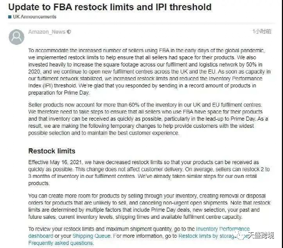 上半年,亚马逊发布公告表示从7月1日开始,库存绩效指数(IPI)分数阈值将由450分变为500分,IPI指数未达标的卖家将受到仓储限制。