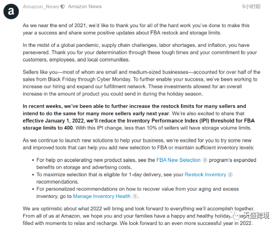 公告表明,最近几周亚马逊一直在着力改善卖家的补货限制问题,并将在明年初进行进一步提高:从2022年1月1日起,亚马逊物流仓储限制的库存绩效指数 (IPI) 阈值降低到400。