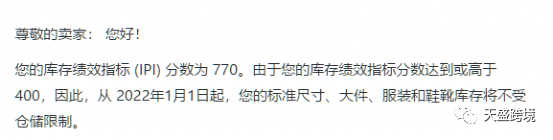 一位IPI分数为770的卖家收到亚马逊的通知:由于您的库存绩效指标分数达到或高于400,因此从明年1月1如起,您的标准尺寸、大件、服装和鞋靴库存将不受仓储限制。