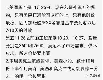 对于美森的突然降价与突然涨价,有货代表示,黑五(11月26日)临近,不少卖家都想多出货,目前只有美森正班船可以赶上旺季,而根据美森安排的正班船班次与承载量来看,再次出现了供不应求状态,所以要上调价格。
